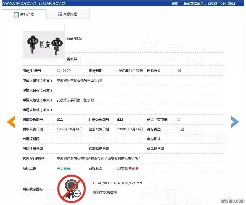 第二件国庆商标使用商品为水泥,但由于有效期满,注册人没有办理续展,该商标已经失效。