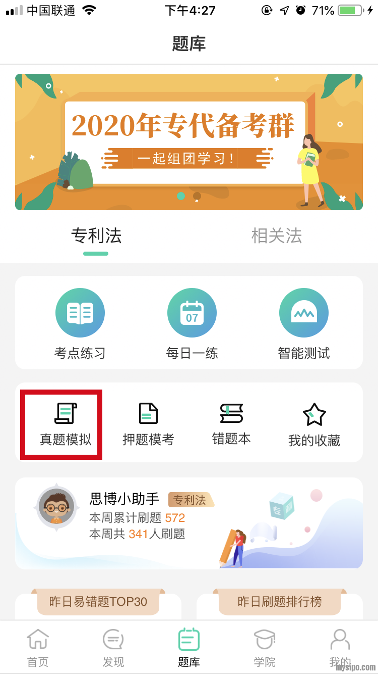 2019年专利代理师资格考试真题刷题,操作步骤如下:打开思博APP,找到”真题模拟“板块