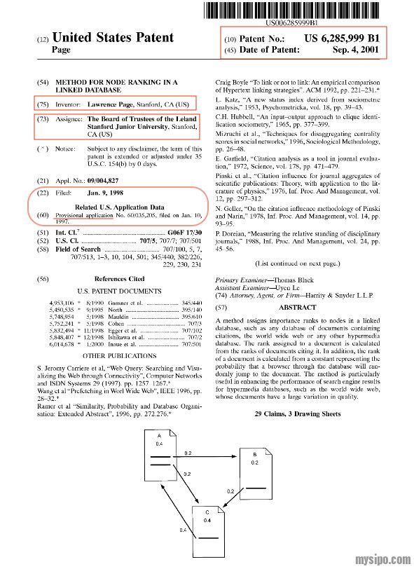1998年1月9日,美国STANFORD大学向美国专利商标局递交了学生Page的PageRank的网页排名专利,并于2001年9月4日获得专利权(US6285999 ,Method for node ranking in a linked database )。