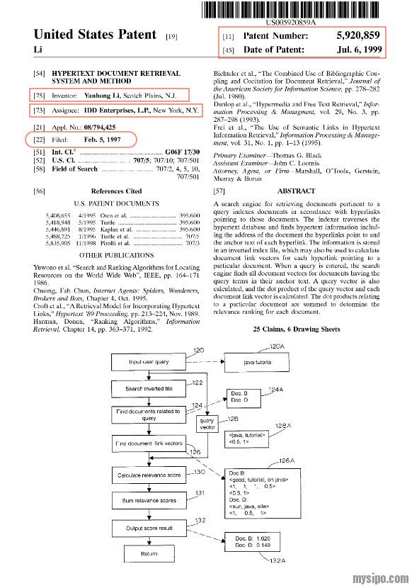 1997年2月5日,美国公司IDD enterprises向美国专利商标局递交了员工Robin的超链分析专利,并于1999年7月6日获得专利权(US5920859,Hypertext document retrieval system and method)。