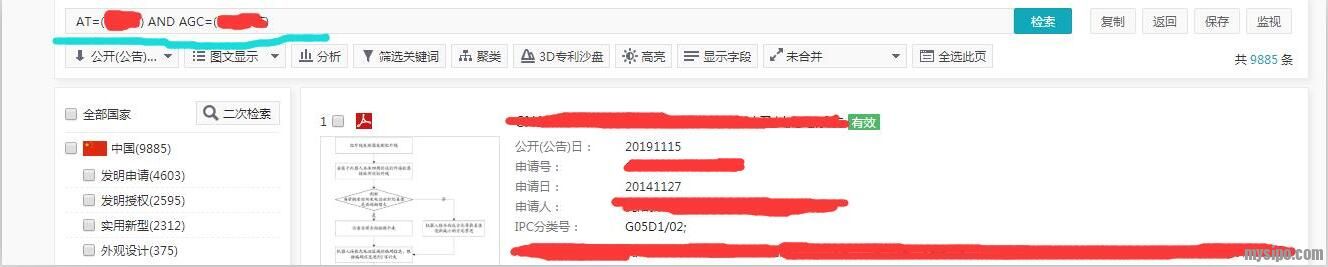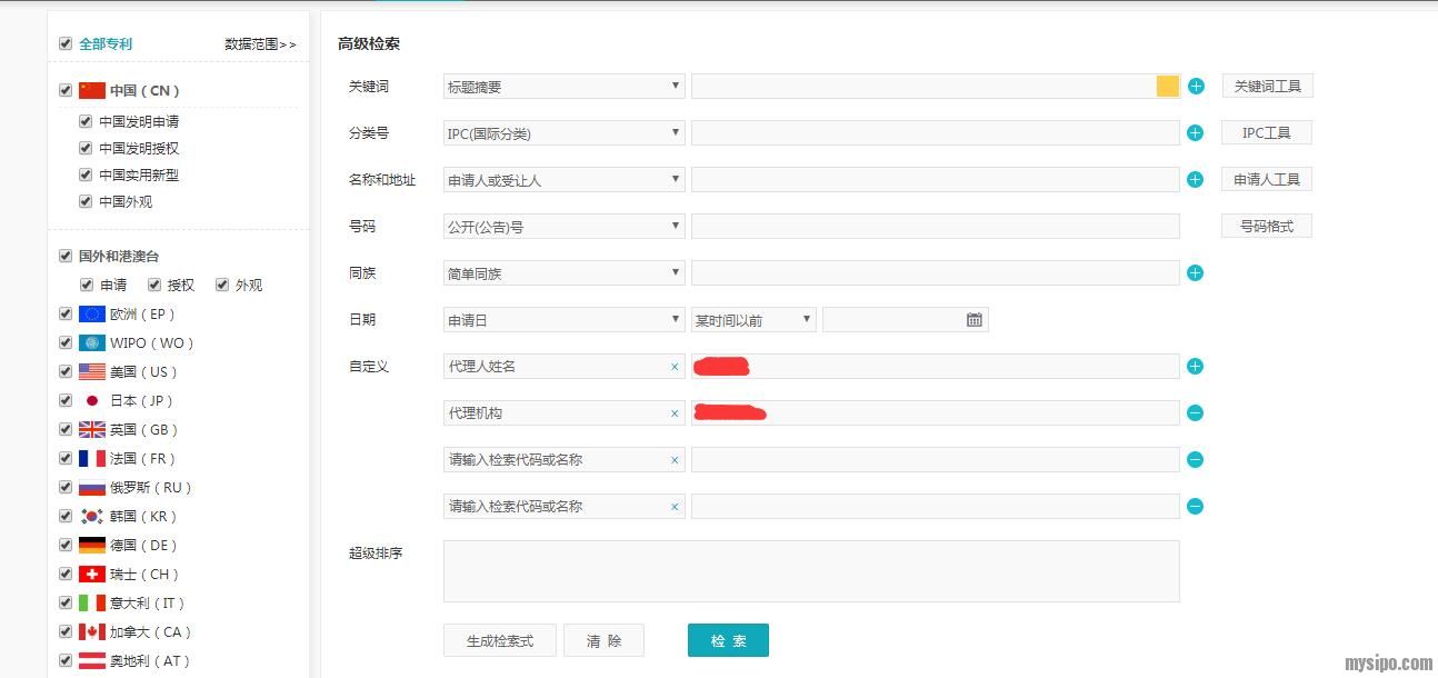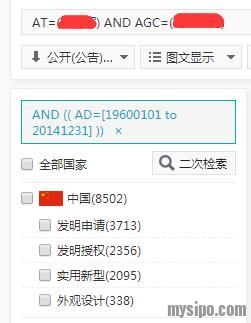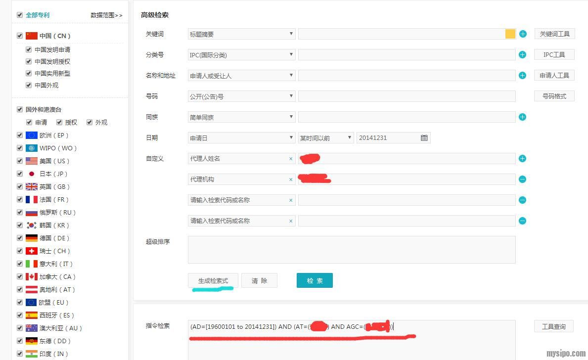 图中上面的搜索框中的是生成的检索式,如果打错人名或者代理机构的名字,或者想更改其他人名和代理机构的话,可以直接在该搜索框中将对应的内容修改即可