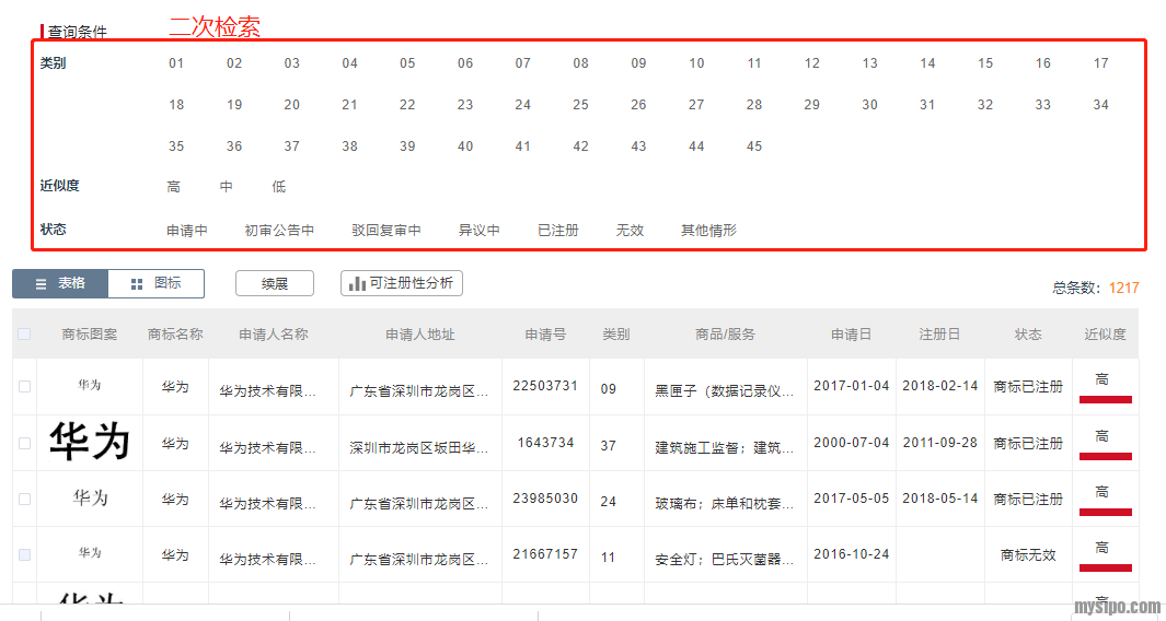在检索界面设定好相关的内容后,点击”查询“即刻进入结果界面。结果界面是用于批量浏览检索结果的界面,顶部的查询条件是方便对结果二次检索,底部是按近似度依次排列的商标信息。