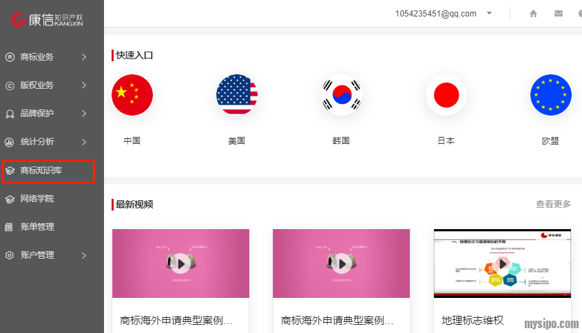 如果在实务中对商标的知识点有所模糊,还可以点击“商标知识库"(下图)。里面有介绍主流国家商标注册流程的“快速入口”、免费教学课程、最新商标资讯等内容。康信作为国内一线的知识产权服务商,相关资料的整理汇总还是很认真可靠。