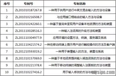 2016年百度称搜狗旗下拼音输入法和手机输入法侵犯百度将近十项技术专利,均是关于输入法产品,涵盖用户输入时常涉及到的表情输入、词库联想、个性化设置同步、输入修改等方面,涉及专利号及名称: