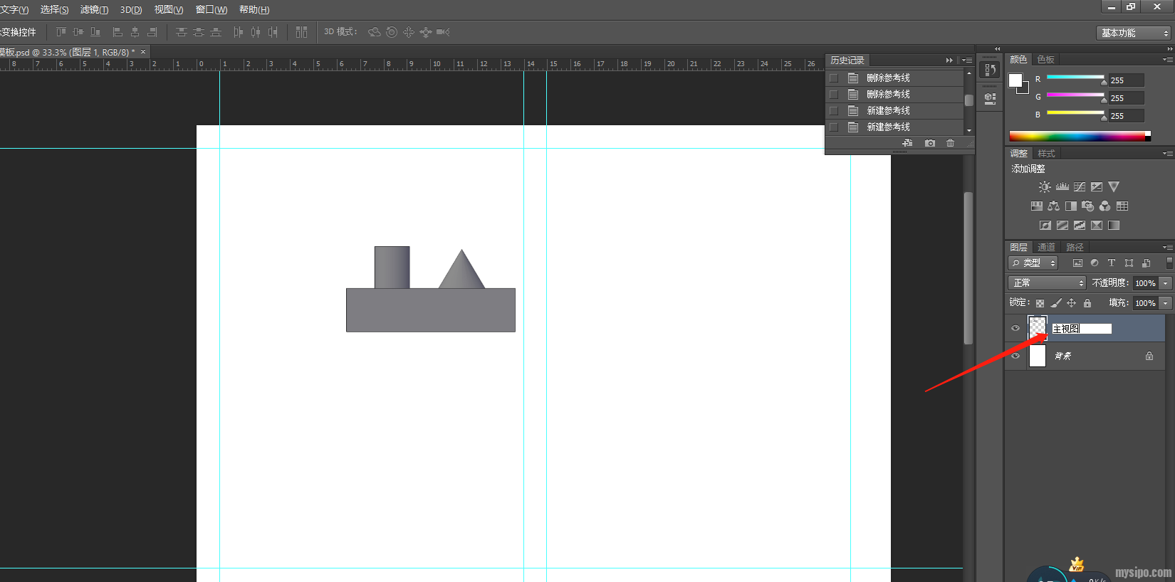 3、将对应的视图截图到背景图片中,修改其图层名称并按参考线调整其尺寸双击对应图层名称可以修改对应的图层名称,建议以对应视图名称对图层进行命名,便于后续排版和调整(如主视图、后视图。。。。)