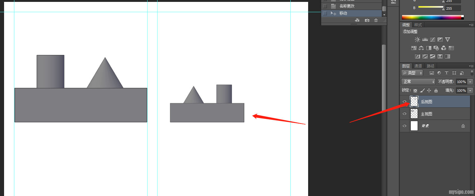 主视图调整好后,按同样方法将后视图拖拽到背景图纸中,并修改图层名称: