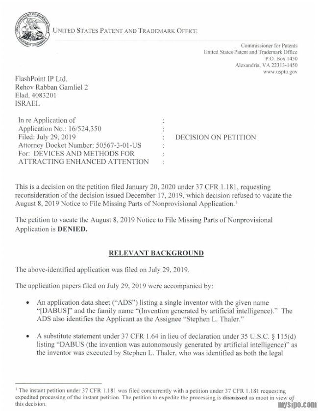 美国专利商标局驳回了这两项申请,并援引法院的判例:法人团体(而不是团体内的个体)无法成为合法的专利发明人。他们还主张:「发明过程中最关键的构思行为必须由自然人执行」。