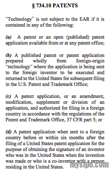 对技术出口的限制也主要是指保密的材料,对于包含在专利或已经公开的专利申请中的技术,不在EAR规制的范围之内,这一点EAR有明确的规定: