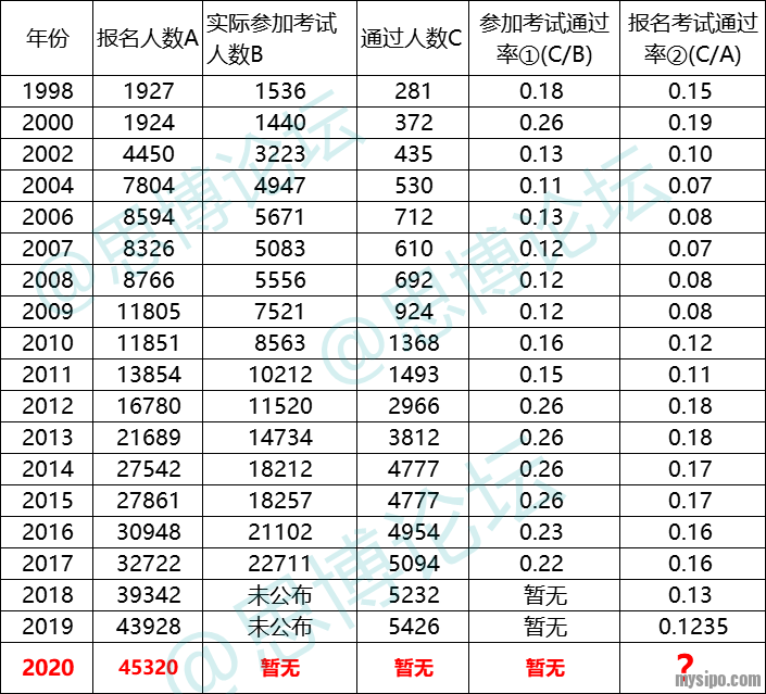 可以看这个帖子:2019年全国专利代理师报名人数新鲜出炉,历年专代考试报名人数及通过率一览(1998-2019)