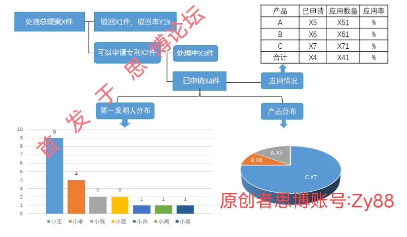 工作隔三差五就要写总结,月度,季度,年度总结都有可能涉及,最近在写总结时自创了一页PPT形式能够清楚简要表达处理的提案数,提案进度,已申请专利涉及的产品,应用率,第一发明人信息。