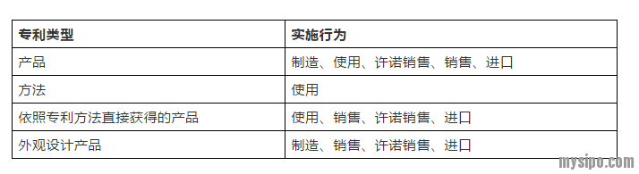 专利法规定的专利实施行为,是穷举式的,如下表所示。
