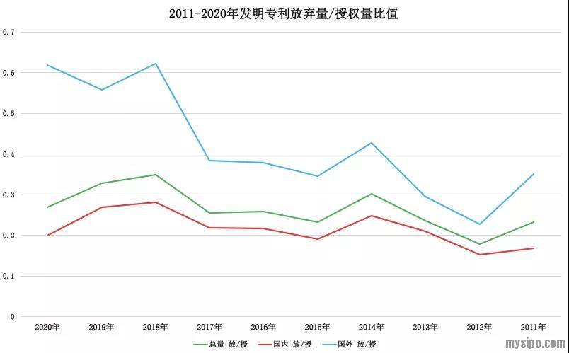 国内主体的放弃比例最高值是2017年的66.6%,国外主体的放弃比例最高值是2011年的52.5%,即国内主体的放弃比例增长和国外主体的放弃比例下降。上述两项数据与国内外主体的发明专利申请量存在较大相关,但国外主体的授权比例和放弃比例均是下降的。