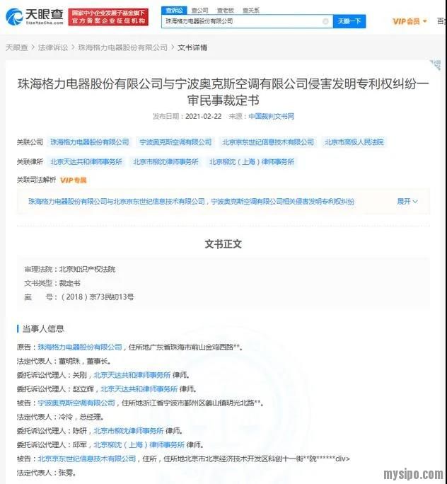 据眼查App显示,2月22日,珠海格力电器股份有限公司与宁波奥克斯空调有限公司侵害发明专利权纠纷一审民事裁定书公开。案号为(2018)京73民初13号,原告为珠海格力电器股份有限公司,被告为宁波奥克斯空调有限公司、北京京东世纪信息技术有限公司。