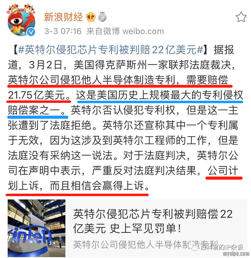 据媒体报道,这次英特尔的案子没有被认定为“故意侵权”,因此是实打实的“侵权损失”。