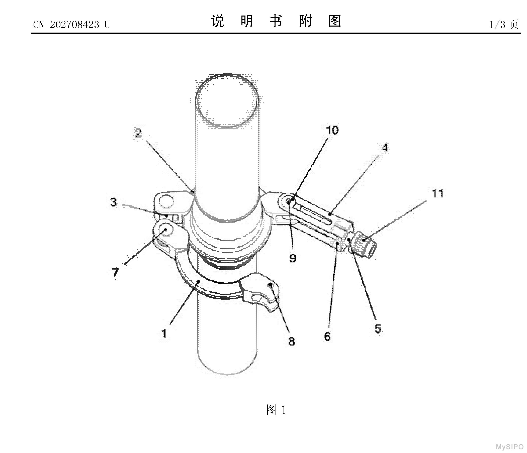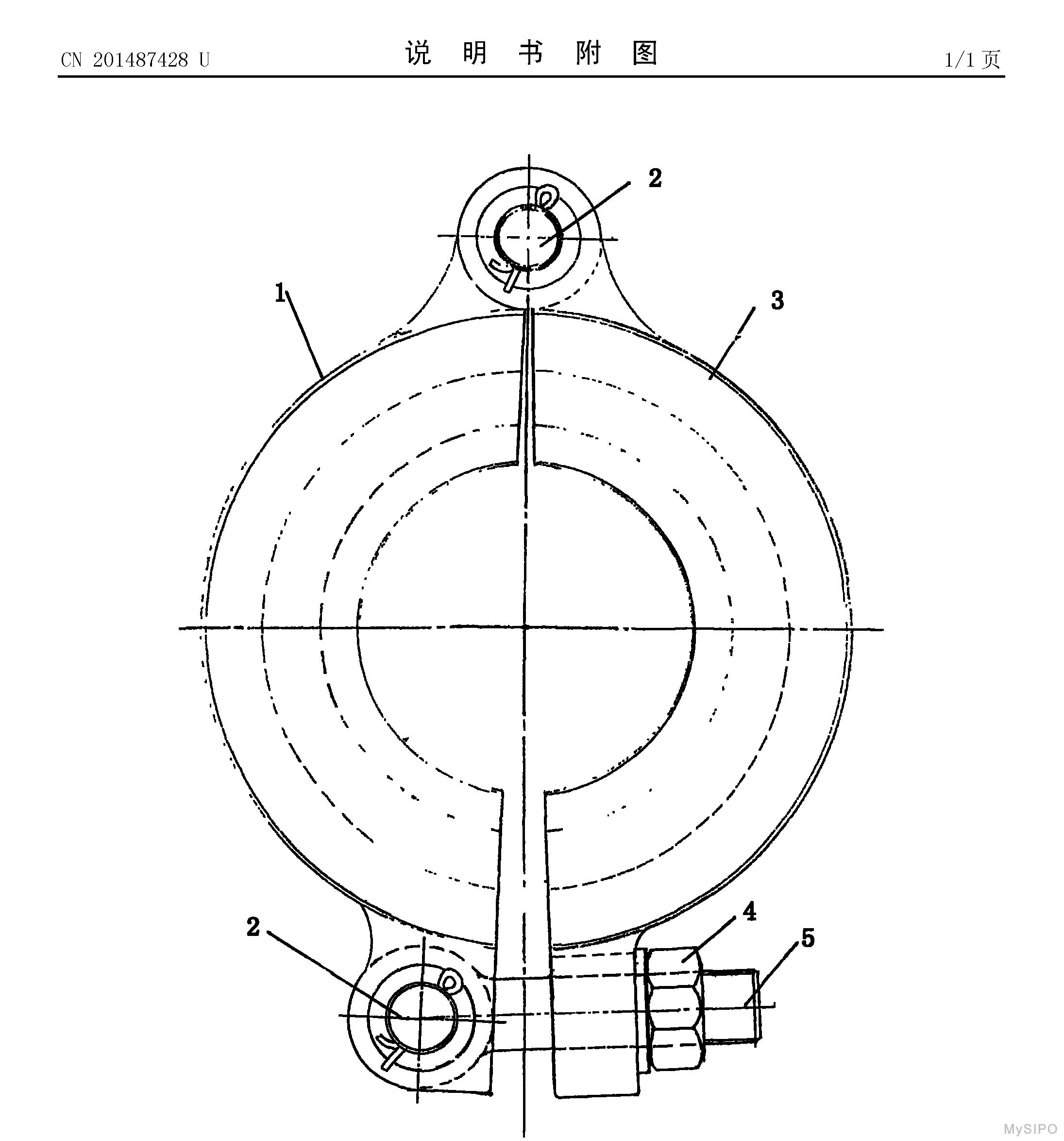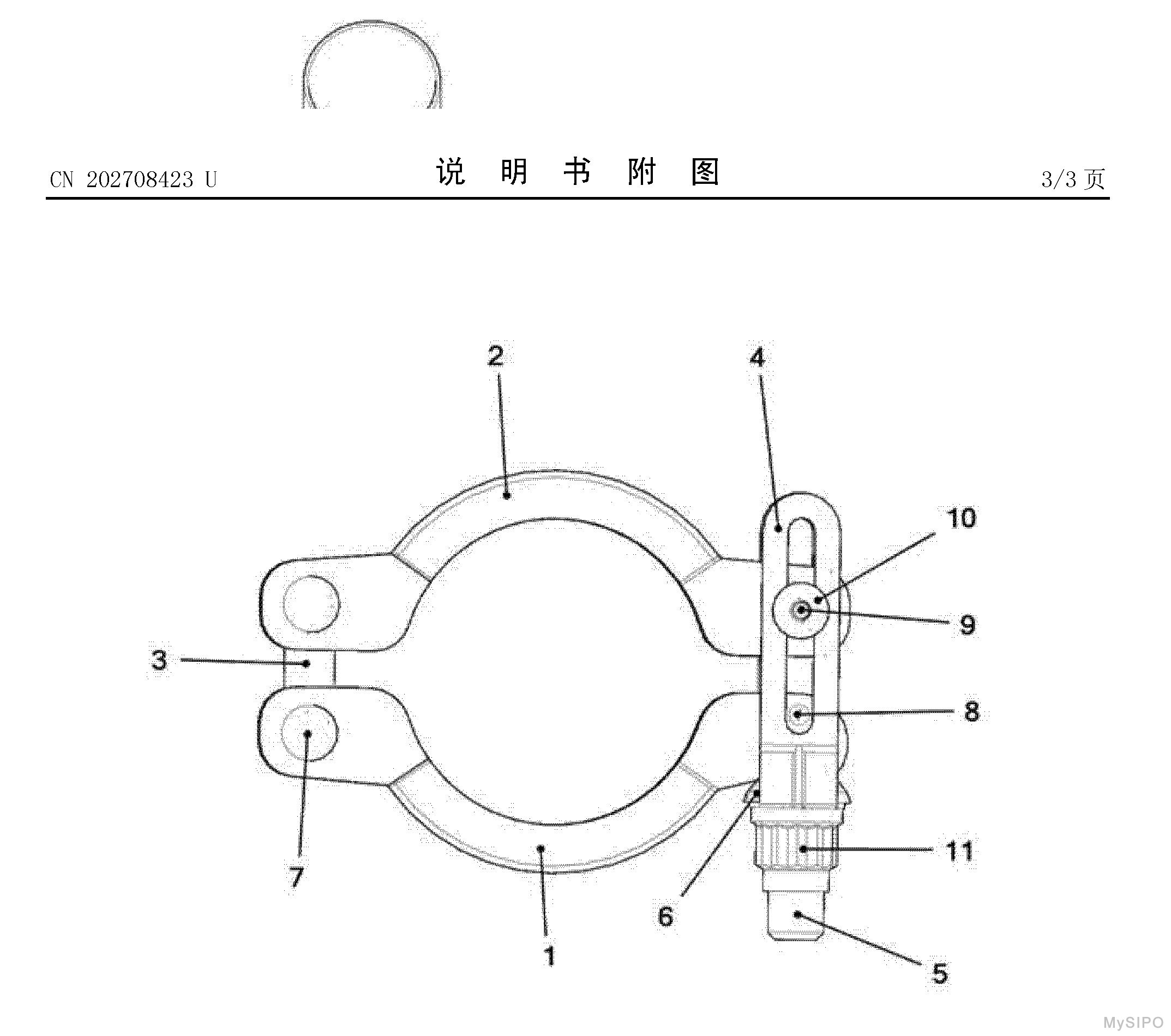 冒着被领导训斥的危险,我检索了一下有关卡箍的专利,发现该下图的专利与涉案专利很类似,申请号就在图中,大家可以自己下载看,简单解释一下,该卡箍为了防止元件散落,采用一体式结构,两个卡环,一端为铰接,另一端通过螺母11结构连接,有一连接杆3和5。
