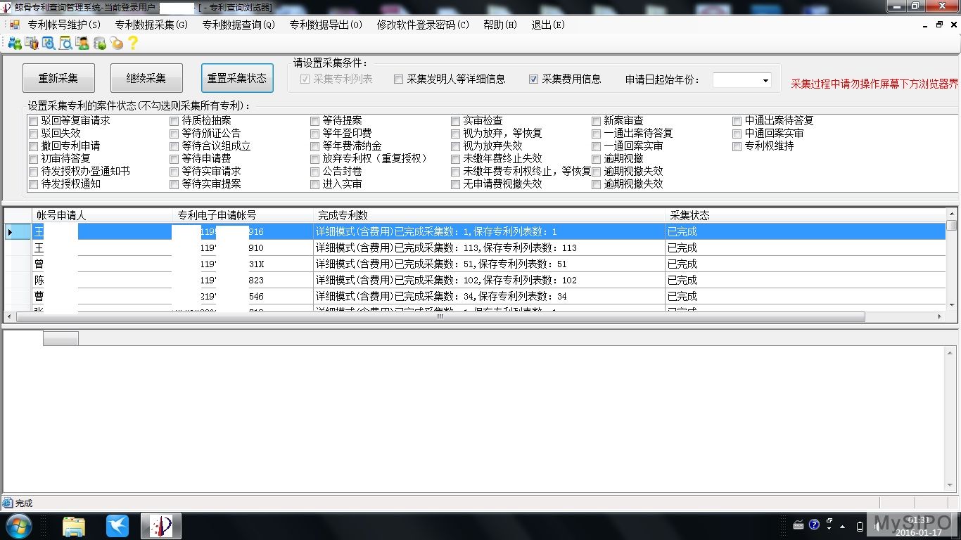 采集“中国及多国专利审查信息查询”系统中的专利信息,所采集的专利信息包括:1,著录项目信息;2,费用信息和相应日期;3,案件状态。