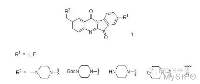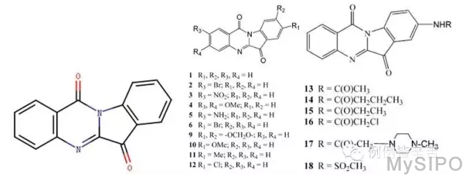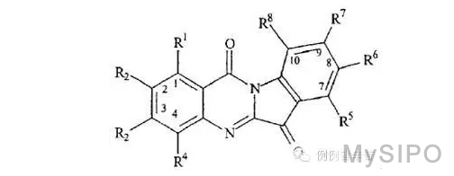 CA2369448A1则是一个公开了100多个色胺酮类化合物抑制剂的专利申请,但是在申请人所合成的这么多个化合物之中却在R2位置上只涉及了-NH2而没有尝试更多的N取代基团。也许正是因为这个原因,后面的那些专利大多从R2位置进行了“突破”,找到了一些机会。但是无论如何,这是一篇非常重要的可以用来评价相关专利(申请)创造性的好素材,影响了727专利家族的创造性和少部分化合物的新颖性。