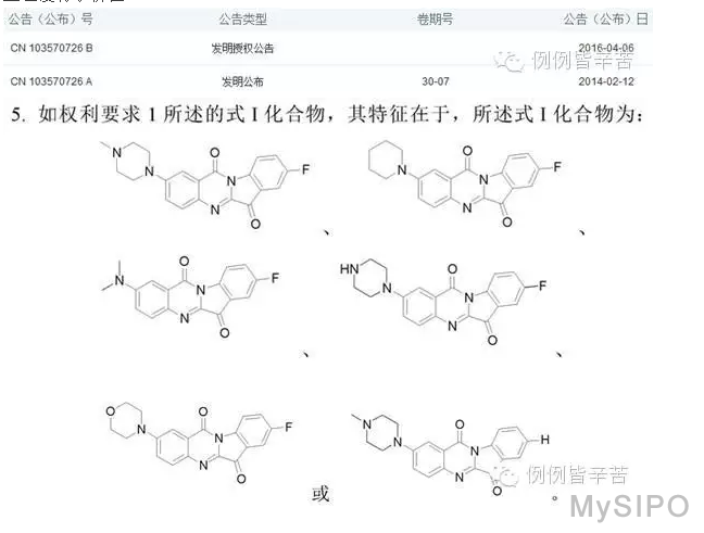 CN103570726A则是一个让我觉得比较震惊的发现,凑巧的是竟然是笔者正在写作的当天(2016年4月6日)授权公告的。摘选授权版本中的权利要求5可以发现这个专利要求保护的内容几乎和727专利如出一辙,但是这个专利的申请日为2013年7月15日,在727专利之前,但是公开日为2014年2月12日在727专利之后,它属于727专利的抵触申请,影响了727专利家族核心化合物的新颖性。这样一来情况复杂了,727专利以及要求其优先权的PCT专利的大部分核心化合物的新颖性出现了问题。由于727专利已经授权,而且只有3个权利要求,根据中国专利法的规定,727专利只能通过删除的方式修改权利要求。这里引入一个问题,就是马库什权利要求的删除式修改是按照一般权利要求那样整条删除还是可以将其中的并列选择个别删除?这个问题稍有争议,不过我个人是偏向于赞同可以个别删除的。如果该权利要求整条删除,则727专利已经毫无存在价值了;如果可以个别删除,那么727专利仅仅因为新颖性问题从10个化合物中所能保留下来的个数基本上也没有几个了。再加上其他对比文件用来对付它的创造性,这个专利基本上也没有了价值。