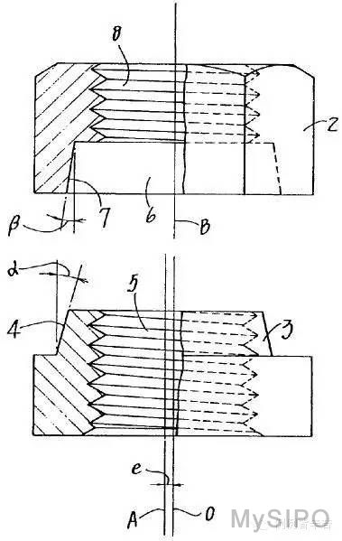 追溯到最早的偏心螺母专利是JPS57184308U的实用新型专利(上图),从专利文件来看,这个1981年的专利申请与现有产品的区别是该专利申请中揭示的“凹螺母”和“凸垫圈”。到了1985年的JPH03526B2发明专利(下图),要求保护的“凹凸螺母”基本上已经是和上文中的原理图以及市面上产品的图片相一致了,该专利的示意图中对于凹凸的夹角α和β有所提及,似乎有技术诀窍的嫌疑。但是我个人觉得夹角这样的技术诀窍不应该成为现在加工技术中无法复制的“拦路虎”。