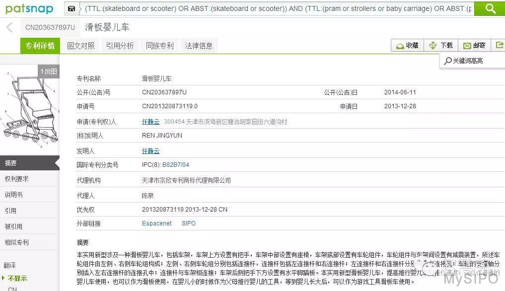 接下来就是爸爸妈妈的福利了。这项专利很好的将滑板和婴儿车结合在一起,帮家长们省力哦!但是很多妈妈肯定会觉得这不安全,不过爸爸们可以试试。