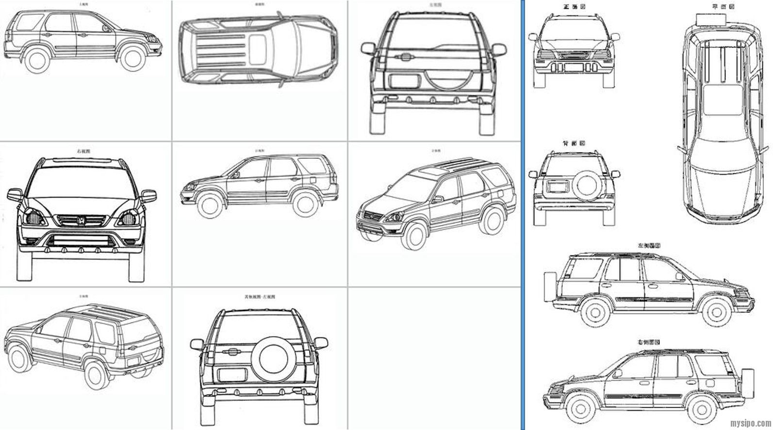 1, 上图左是本田公司CRV外观设计专利文件,右图是无效申请时作为对比例的同样是本田公司在日本的外观设计专利。复审委、北京一中院和北京高院均以整体视觉对比进行判定,认为两者高度近似,认为本田公司提出的显著外观差异的部位都属于细微区别,不予采纳。而最高院在再审决定中指出,整体观察不应仅仅通过对比基本外形轮廓(往往一类车型通常具有类似的外形轮廓),也应对汽车的前面、侧面、后面予以全面观察,汽车的前面、侧面、后面等部位的设计特征变化会更多地引起此类汽车的一般消费者的注意。也就是说,针对购买某类汽车的一般消费者,前大灯、雾灯、前护板、格栅、侧面车窗、后组合灯、后保险杠、车顶轮廓等部位属于设计特征与视觉要部,应当重点关注。而专利文件与对比文件恰恰在这些要部存在明显区别,因而认为外观设计专利与现有设计之间不相近似。