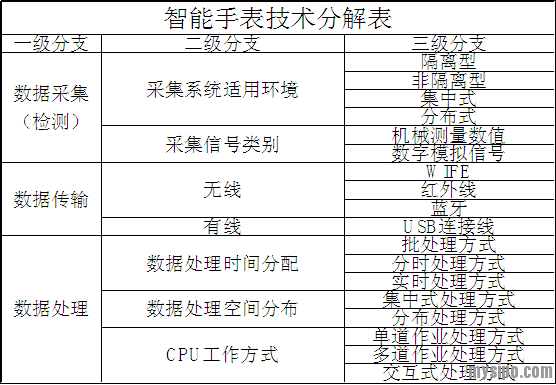 因此,针对本企业而言,将核心技术主题定义为“智能手表”,想针对“智能手表”这一技术板块进行专利布局。按照该第一步所述,确定核心技术主题后,列出所述相关技术主题的核心技术要素。通过前期与技术人员进行沟通交涉,了解到本企业的该项技术大致为:将手表内置智能化系统、搭载智能手机系统而连接于网络进而实现多功能,同步手机中的电话、短信、邮件、照片、音乐;测量人体的基本数据信息如人体体温、心跳频率、血压指数等;通过多种无线方式传输所测量的基础数据信息,如:通过蓝牙的方式传输体温、时间参数等”。因此列出所述相关技术主题的核心技术要素主要为三大块:数据采集、数据传输、数据处理三大块。当然,具体针对每一技术主题分多少个技术要素,视具体情况而定,本文仅以三大块为例进行阐述。但并不表示该技术主题仅有或者仅可以分这三大块,此处笔者先预以澄清。