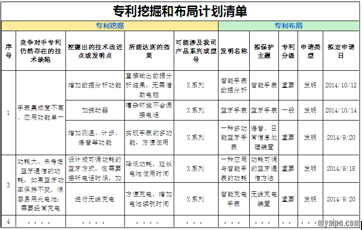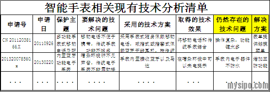 在该步骤中,表中所涉及的,每一个“竞争对数专利仍然存在的技术缺陷”即可认为是一个系列,该系列下的每一个“挖掘出的技术改进点或发明点”即可认为是该系列下的一个专利申请(即,相对于现有技术的区别技术特征),如果一个系列下存在若干个“挖掘出的技术改进点或发明点”,如上表序号1“手表及成都不高、应用功能单一”所示,则可认为该系列下的每一个“挖掘出的技术改进点或发明点”均可作为一个专利进行申请,以此形成该系列下该产品的专利布局。