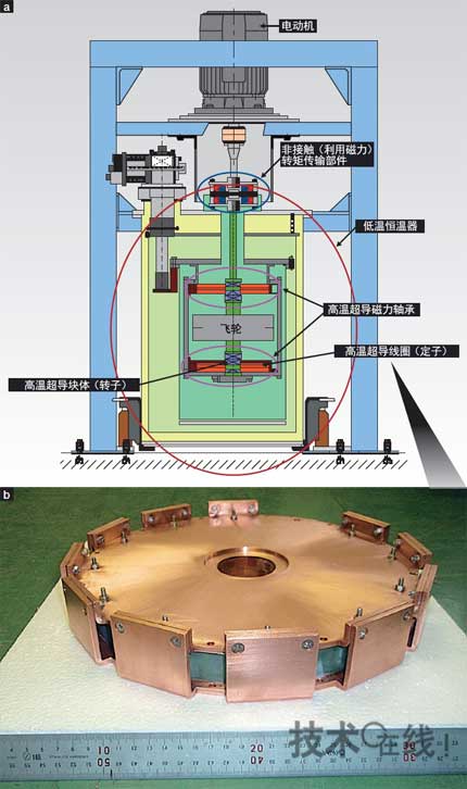 应用于飞轮时,在轴承部分采用高温超导线圈以及后面将提到的高温超导块材,以非接触方式支撑旋转轴。具体而言,就是以高温超导线圈作起动器,支持嵌有高温超导块材的旋转轴(图3)。整个飞轮收放在低温恒温器中,轴承部分以稀薄的低温氦气冷却。通过利用基于超导线圈的电磁铁来支撑超导块体,能够以非接触方式支撑重达数吨的巨大飞轮。(未完待续)