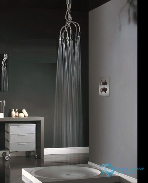 这是英国设计小组Vado带来的雕塑感花洒,它抛弃了传统花洒的单进单出设计,取而代之的是六个较小较细的子喷头,每一个都可以独立弯曲、缠绕以调节角度,既照顾到身体每一寸肌肤的需要,又能让浴室多出一件雕塑般的艺术品。