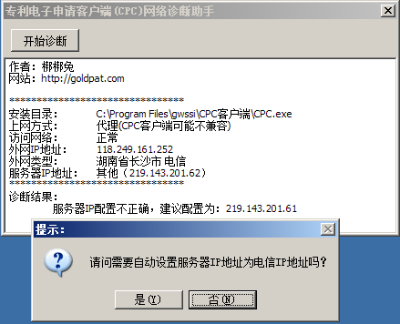 CPC客户端是专利电子申请客户端(CPC客户端)用户遍及全国各地,由于电信、联通之间存在互联互通的问题,为了增强网络稳定性,SIPO的CPC服务器开通了双线服务。但是由于部分用户由于网络设置不正确,存在发送文件慢甚至失败的情况,影响了专利电子申请的推广和使用。所以针对上述情况,我最近写了一个《CPC客户端诊断助手》,用于检测CPC客户端的网络环境,并可以根据提示的确认情况自动修改为正确的网络设置。