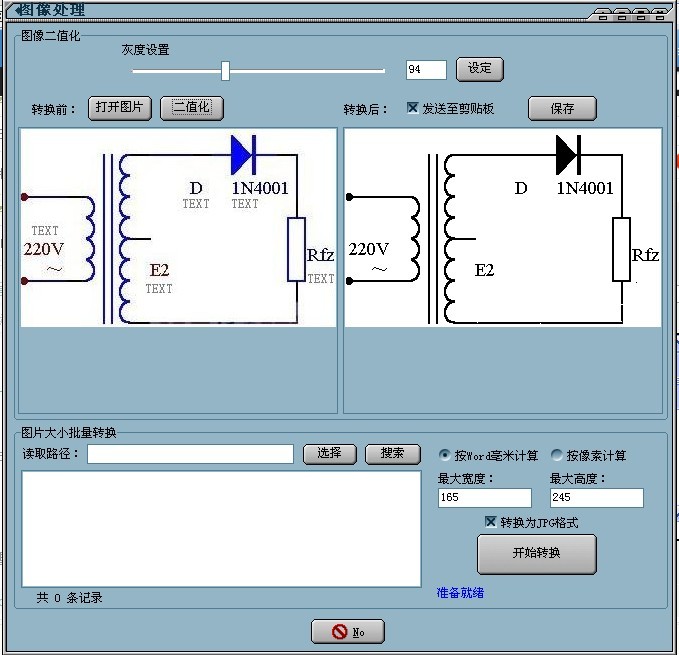 2、图片大小批量转换,支持.bmp、.jpg、.jpeg、.png,用于批量转换图片大小,可按word毫米尺寸或像素尺寸计算(专利附图要求宽度不大于165mm,高度不大于245mm),程序还可自动将其它图片格式修改为jpg格式。