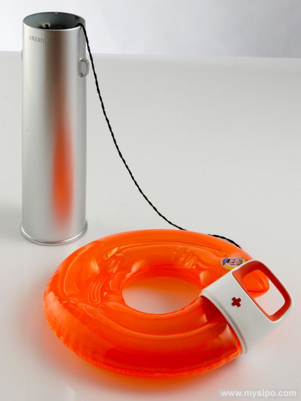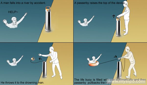 当有人落水时,路人可迅速开启救援装置扔向落水者,内置的充气救生圈遇水便会迅速充气。