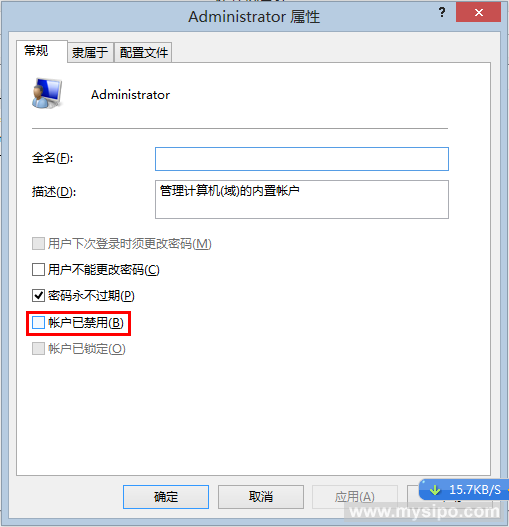 参见图四,在Administrator属性窗口中,取消选择“账户已禁用”的复选框,点击“应用”按钮。