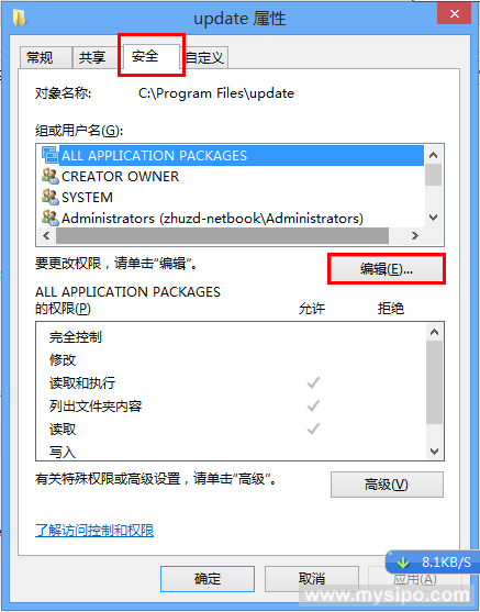 关闭各窗口,注销计算机。用Administrator帐户登录系统,打开C盘下的Program Files文件夹(如果是64位系统,则打开Program Files (x86)文件夹),右击其中的update文件夹,选择“属性”,弹出文件夹属性窗口。参见图五,切换到“安全”选项卡,点击“编辑”按钮,弹出文件夹权限窗口。