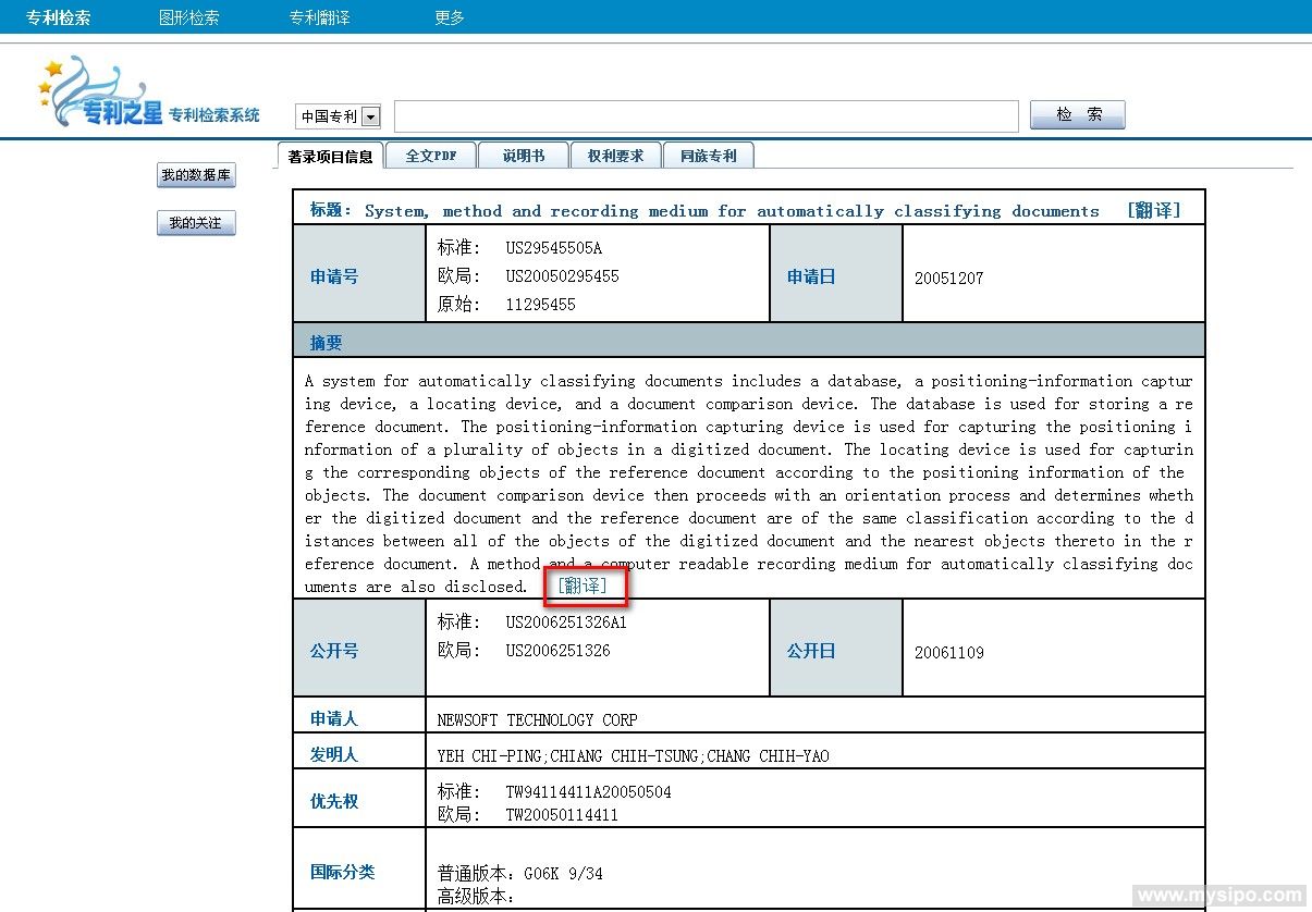 专利之星(CPRS)检索系统可以直接检索后,在专利著录项目页,直接点击翻译按钮,翻译摘要。