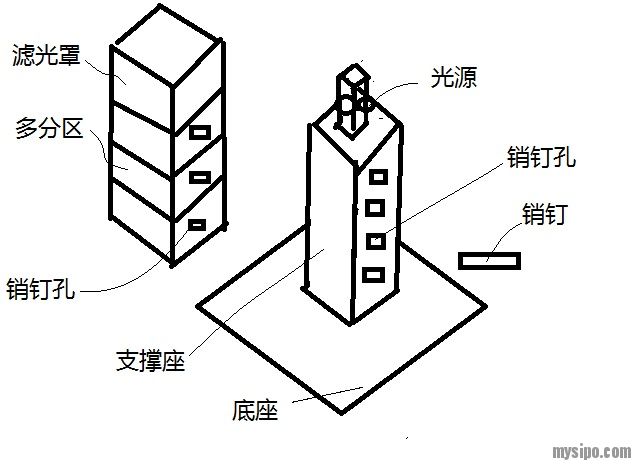 可调光灯,包括灯座,支撑座,支撑座顶部是光源,四方棱柱形滤光罩套设在光源外部,滤光罩分为多个滤光区,可以上下移动,靠销钉定位。