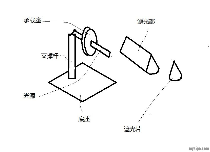 5引用权3或4,进一步包括承载座,光源设置在承载座上,滤光部套设在承载座**,承载座对面有遮光板,滤光部与光源之间设置有灯罩,灯罩向外延伸到滤光部,灯罩的材料优选侣。