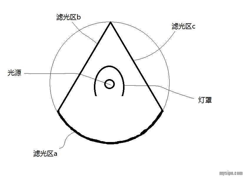 为了抑制小夜灯模式下滤光罩的温升,a区的滤光区距离光源的距离大于其他两个滤光区。