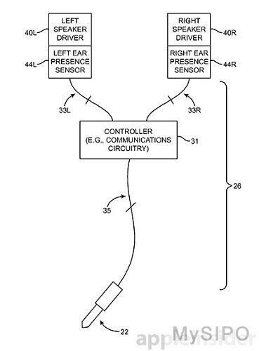 第二项专利跟第一项专利相似,但是增加了一项新的功能:利用传感器控制音乐播放开关。当传感器检测出耳机已从用户耳朵上移除后,设备音乐会自动停止;当耳机又重新插入到用户耳朵时,又会自动播放流媒体音乐。