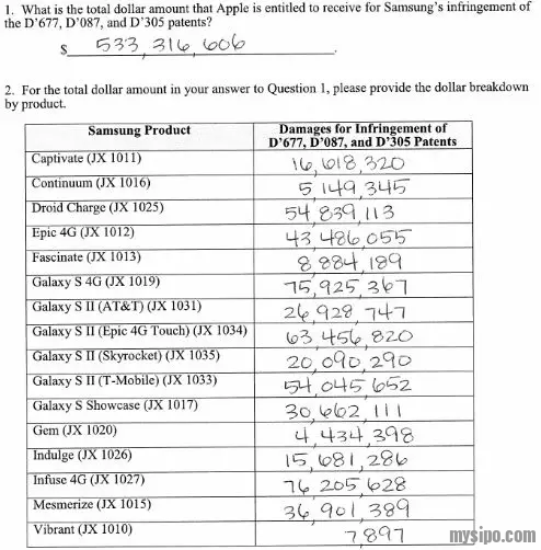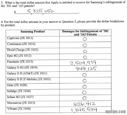 5月24日,苹果与三星的专利大战终于落下帷幕,在美国加州法院,陪审团最终裁决三星侵犯苹果的三件外观设计专利,需赔偿苹果5.3亿美元,侵犯苹果的两件实用专利需赔偿5.3百万美元,总共赔偿苹果5.38亿美元。