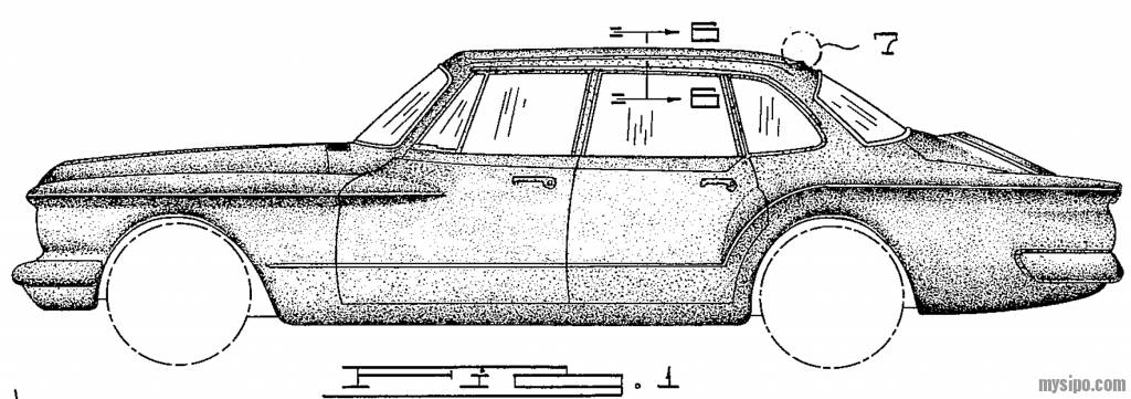 图3显示出了在汽车的外观设计专利中使用点画作为阴影。通过改变点的密度/间隔来提供阴影。可以看到点间距更近,以显示每个车轮上方的水平弯曲度。