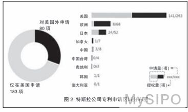 图 2 显示了特斯拉公司专利申请区域分布情况,从图中可知,其 263 项发明专利申请主要集中在美国,并且其中有 183项仅在美国提交了专利申请。由此可见,特斯拉公司将美国作为其最重要的市场。
