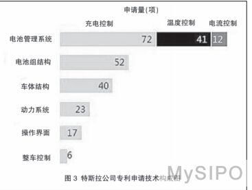 对检索到的专利进行阅读标引和技术分析,得到下页图 3所示的专利申请技术构成图。可以看出,特斯拉公司的专利申请主要涉及电池管理系统(包括电池组的充电控制、温度控制以及电流控制)、电池组结构、车体结构、动力系统、操作界面、整车控制等领域,其中在电池管理系统、电池组结构、车体结构领域,其提交的专利申请量较大。在特斯拉公司擅长的电池管理系统领域,其专利申请量达到 125 项,占其总发明申请量的 47.5%。该公司在电池组结构方面的专利申请也达到了 52 项,可以看出,特斯拉公司在电动汽车电池方面投入的科研力量最大,与电池相关的专利申请已占总申请量的 67%。与此同时,由于特斯拉公司开发的纯电动汽车与传统纯电动汽车不同,其在车体结构、动力系统和操作界面等领域也有一定投入。
