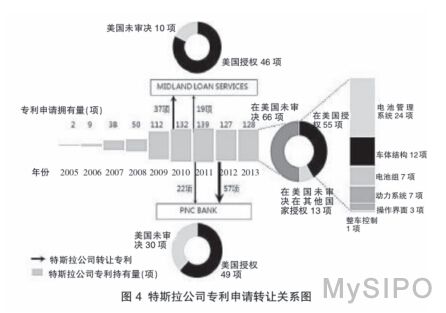 埃伦·马斯克宣布特斯拉公司将开放所有专利技术,那么特斯拉公司真正拥有多少专利呢 ? 笔者对特斯拉公司的专利权属转让情况进行了深入检索统计分析,发现近年来特斯拉公司对所持有专利进行了很多专利权转让。如右图 4 中所示,从 INCOPAT 数据库获知,在 2010 年至 2012 年间,特斯拉公司名下的 271 项专利申请中有超过 135 项发生过专利权属转让(assignment),其中 79 项转让给了 PNC 银行协会(PNC BANK,NATIONAL ASSOCIATION),56 项转让给了米德兰**服务公司(MIDLAND LOAN SERVICES,INC.),并且有 20 项专利申请涉及两次权利转让,都是先转给米德兰**服务公司,再转让给了 PNC 银行协会。