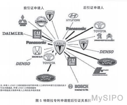 笔者又继续对特斯拉公司与电动汽车相关企业的技术关联性进行了研究。将特斯拉公司所持有的美国专利进行引证和被引证分析后,得出了如图 5 所示的特斯拉专利申请前后引证关系图。
