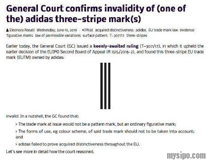 据报道,欧盟一法院判决:阿迪达斯的三条纹标识在欧盟28个成员国中不够独特,因此裁定其商标无效。