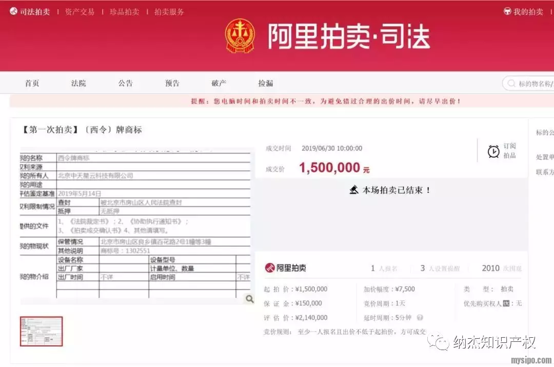 说起商标拍卖,蜗牛纳倒是想起此前即将破产倒闭的北京中天星云科技有限公司,将“西令牌”商标在“阿里拍卖”以150万元的价格成交的例子。负责人便是用拍卖商标的方法解决了公司财产变现和债务清偿的难题。
