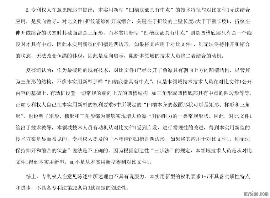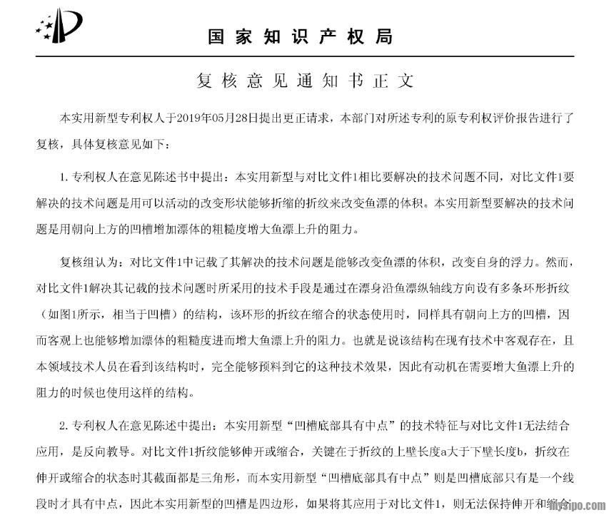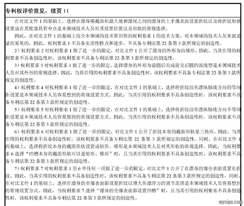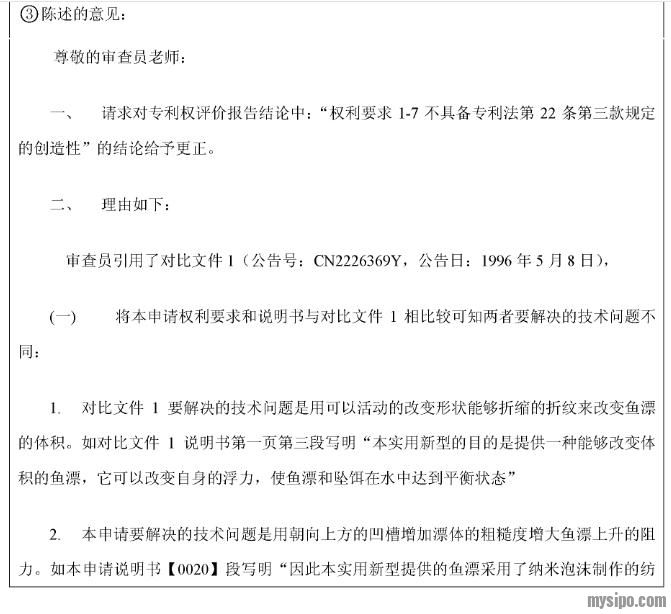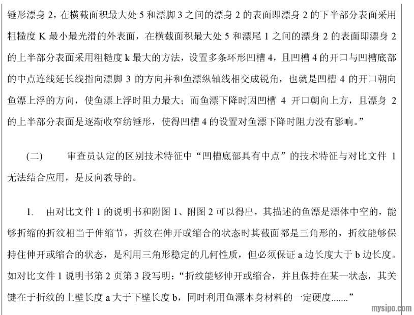 对比文件技术方案存在的问题:使用时需要人工参与调节鱼漂折纹使鱼漂在不同水中获得相同浮力,需要反复测试调整确定以获得准确的体积,因此使用中调整不准确,调整麻烦是可以预见的。---另外,对比文件必须是一气密空间,当改变折叠时鱼漂内空间减少气压增大,在气压作用下,鱼漂的形状必然会恢复原有状态(高中知识)因此鱼漂不能稳定的稳定在水中。