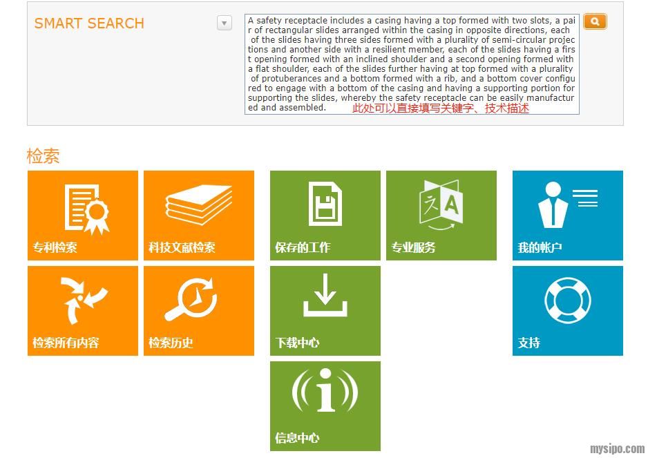 登录DI后会直接跳入如下图所示的界面,上半部是 SMART SEARCH 可以直接输入关键字或技术描述开始检索工作,下半部展示了各个功能模块供使用者按需选择。