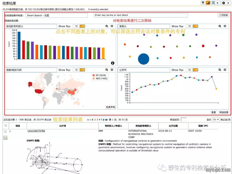DI的检索结果界面还是挺有特色的,很多数据库将二次检索的选项放在检索结果列表的左侧,DI则将二次检索的选项置于顶部,同时还采用交互式图表参与二次检索。